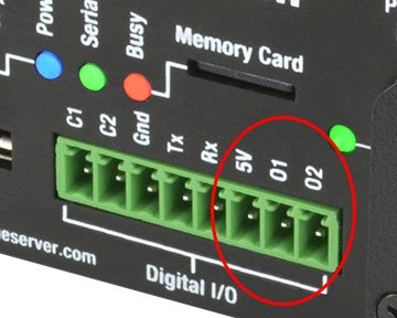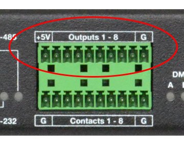 CueServer 2 provides up to eight low-voltage digital outputs. These outputs are designed for connecting LED indicators, small relays, buzzers, pilot lights, and most anything that can be powered from a small DC voltage.
