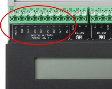 For convenience, an auxiliary 5VDC output is provided with the digital outputs. This voltage source can optionally be used to provide power to LED indicators, small relays, etc. The maximum current available at the Aux +5VDC Output is 200mA.