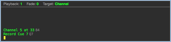 Enter a CueScript command (like Channel 5 at 33 or Record Cue 7) and CueServer performs the requested task. Whenever a command is entered, the CueServer replies with a value (which is shown in gray text after the command).