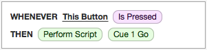 One of the options in the then do something clause of a rule is to perform a CueScript. In the example above, whenever this button is pressed, execute the command Cue 1 Go.