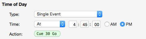 When editing a Timer or Macro, an action field appears, allowing a CueScript command to be entered as the object’s action. Whenever the Timer or Macro is triggered, the programmed action is performed.