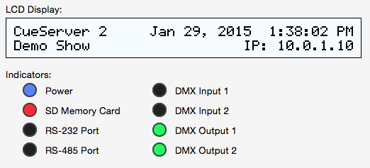 As the LCD display and/or LED indicators on the physical CueServer changes, they are updated live on this view.