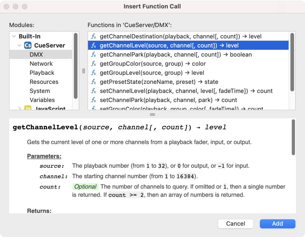 CueServer functions can be written using CueScript or JavaScript syntax.