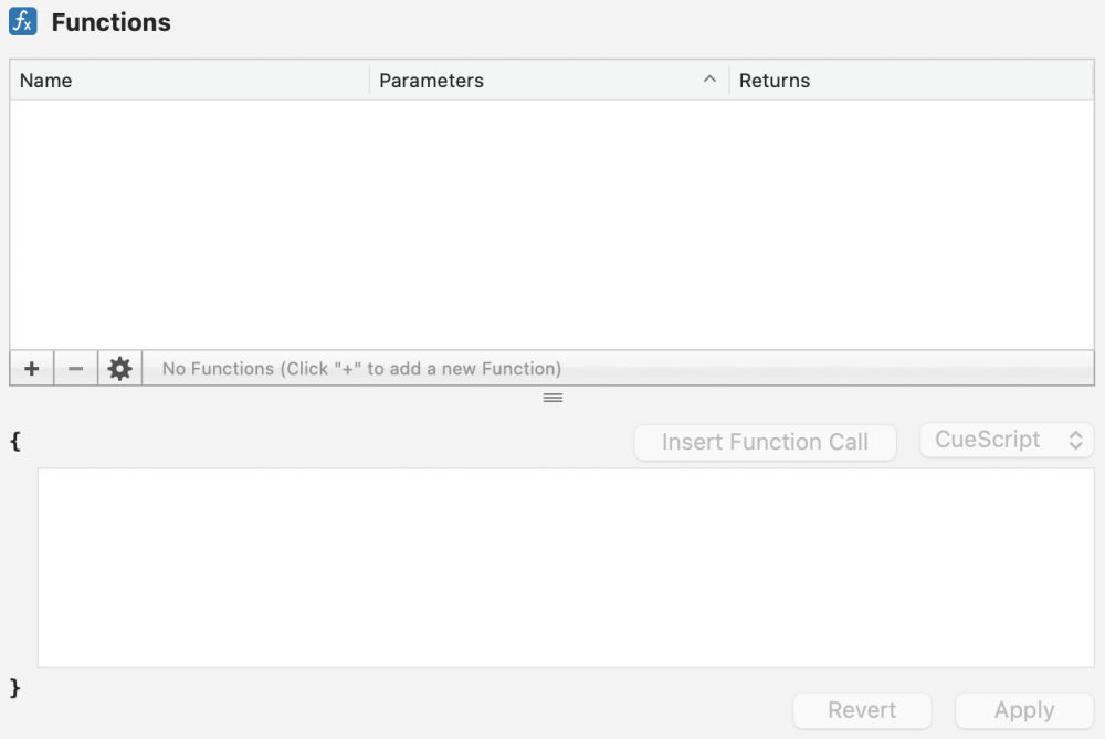 The Function editor is where you add, modify, or adjust user-defined CueScript or JavaScript functions.