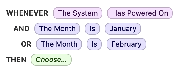Additionally, conditions can have OR statements. For example, AND The Month Is January OR The Month Is February. To add an OR statement to a condition, hover over the end of the condition and press the add OR button ( ).