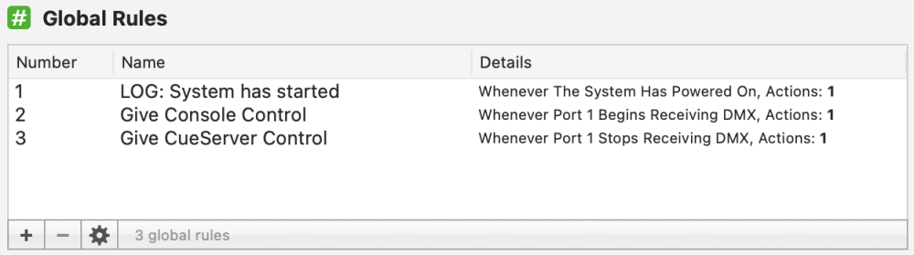 Global Rules are configured using the Global Rules section of the TRIGGERS group within CueServer Studio.
