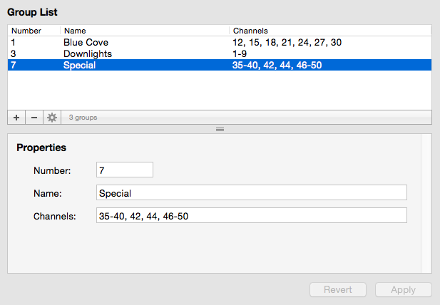 A group is a collection of one or more channels. Groups are used as shortcuts for recalling a specific set of channels. Groups can be used to select channels, set channel values and more.
