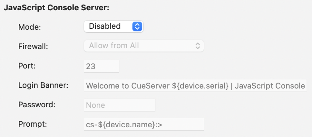 The JavaScript console server is a network terminal that accepts and executes JavaScript on the CueServer.