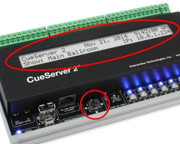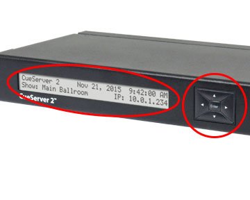 Some CueServer 2 models have a front-panel LCD Display with navigation buttons. This display is used to see the overall operational status of the device and can be used to adjust a small subset of settings and perform basic diagnostics.