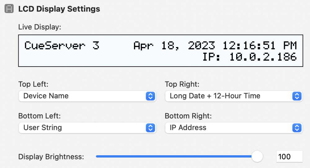 Brightness can also be set using CueScript, via the lcd.backlight System Variable.