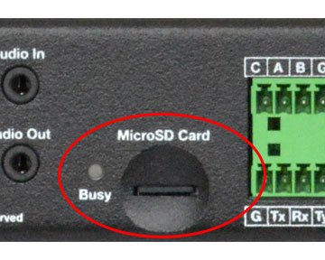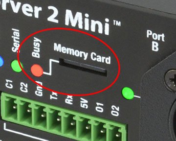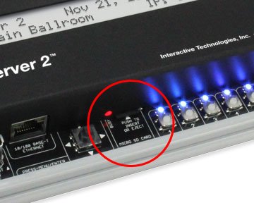 CueServer 2 uses a microSD memory card for storage of show files. Units ship from the factory with “Class 10” 16GB cards pre-installed.