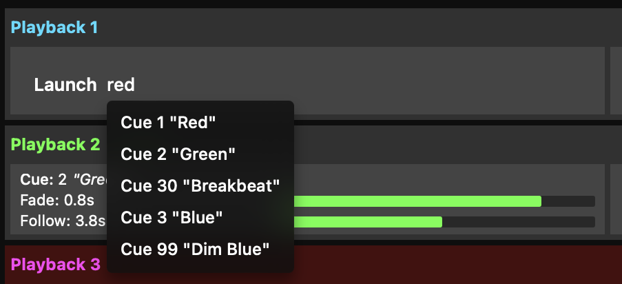 - Go Cue… – play a selected Cue from the Playback’s active Cue List.