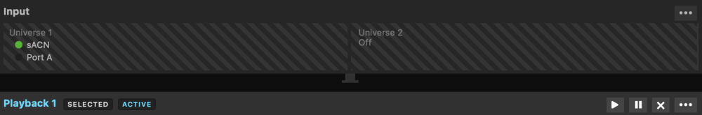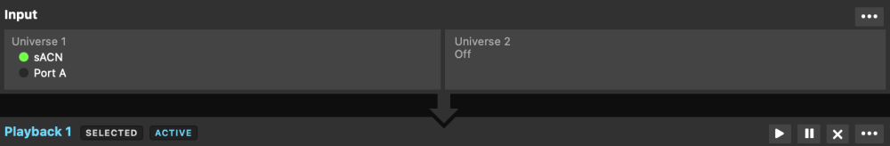 Click the ellipsis ( ) button in the top-right to enable or disable the input layer. When input is disabled CueServer will not pass input values through to the playbacks, the input layer’s arrow will be broken, and a crosshatch pattern will cover its universe blocks.