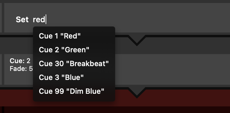 Left-click on the pane to type in a Cue number, name, or keyword. Typing a number followed by the enter key will set that Cue as next. Typing a name or keyword will bring up a list of matching Presets and Cues to select from. You can click an item in the list, or use the arrow keys to traverse the options and then press enter on the option you want. Click outside of the pane, or press the escape key, to cancel.