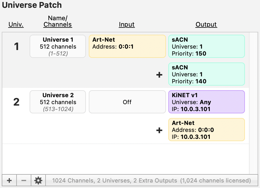 The universe patch is displayed as a series of rows, each with four columns Universe Number, Name / Channels, Input and Output. Rows without information in the first three columns are additional outputs for the closest universe above them. Across the bottom of the universe patch is a textual synopsis of the current configuration.
