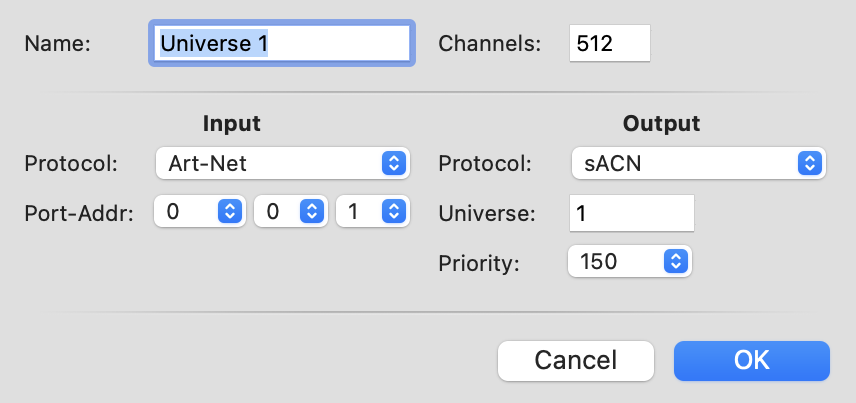 Each universe can be configured to have 1-512 channels, a custom name, and a DMX-over-Ethernet protocol configured as an Input and one or more outputs. These options can be configured in the properties panel of each universe.