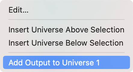 Universes can have extra DMX-over-ethernet outputs to send the content from a universe to multiple destinations or over multiple protocols. To add an output to a universe, right-click on the universe or select the universe and then use the gear (