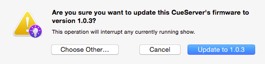 If you want to update the CueServer to a different version of firmware, click on the Choose Other… button. A file chooser window will appear that will allow a different firmware version to be loaded. CueServer firmware files have the file extension .c2f.
