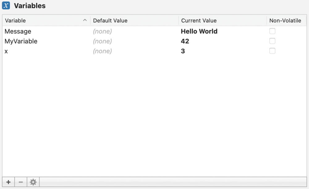 The Variables editor can be used to view, create, edit, and remove variables from the project.